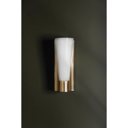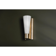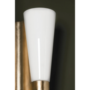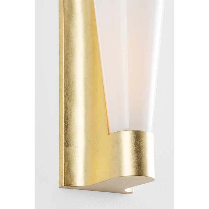 This stately sconce is very architectural in form. A sculptural backplate extends from the wall to hold an opal glass shade. The softly angled shade casts a gorgeous all-around glow and light reflects beautifully off the Vintage Gold Leaf metalwork. Abner feels warm, comfortable, and super useable.