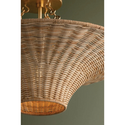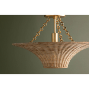 Hand-woven from natural wicker, Ketan puts a playful spin on a design inspired by Charlotte Perriand. The inverted trumpet shape of this semi-flush emits both up and downlighting, with the exposed bulb casting a powerful beam. Completing the fixture's fresh appearance is a simple chain and canopy cast in Vintage Gold Leaf.