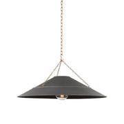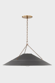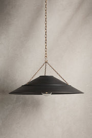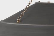With its exposed metalwork, chain detailing, and unique finish combination, Arcane has an elevated, industrial vibe. The graphite shade feels chic and gives off a warm glow. The Patina Brass hardware, chain, and canopy add a hint of shine that plays wonderfully off the graphite. The twisted black fabric cord is a subtle detail that gives the pendant a vintage feel.