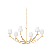 While minimalist in form, Bo features decorative flourishes rooted in heritage. The graceful arms of the chandelier swoop upwards, culminating in a delicate curl on which each candle rests. Tapered white linen shades provide a sense of tailoring while the Vintage Gold Leaf finish feels fresh and upscale.