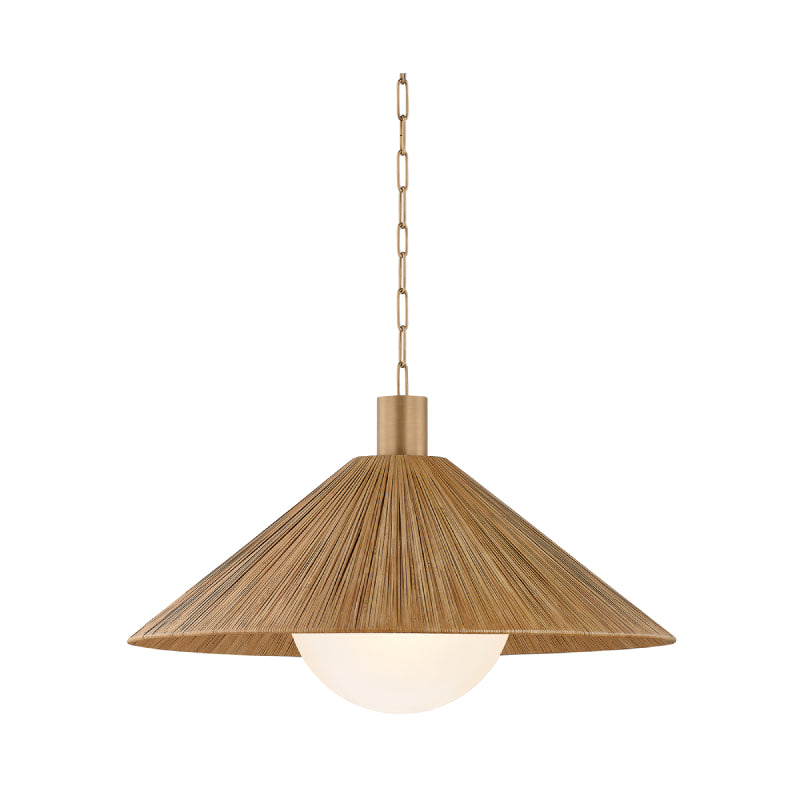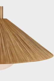Elevating classic RLM design language, the Woodside pendant incorporates natural materials and unexpected proportions. The conical shade has been woven from flat rattan, giving the piece a highly textural, organic quality. A large etched glass globe protrudes from beneath the shade, adding considered geometry to the composition. When lit, the rattan glows with a reddish-brown hue that feels warm and inviting.