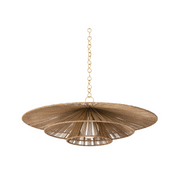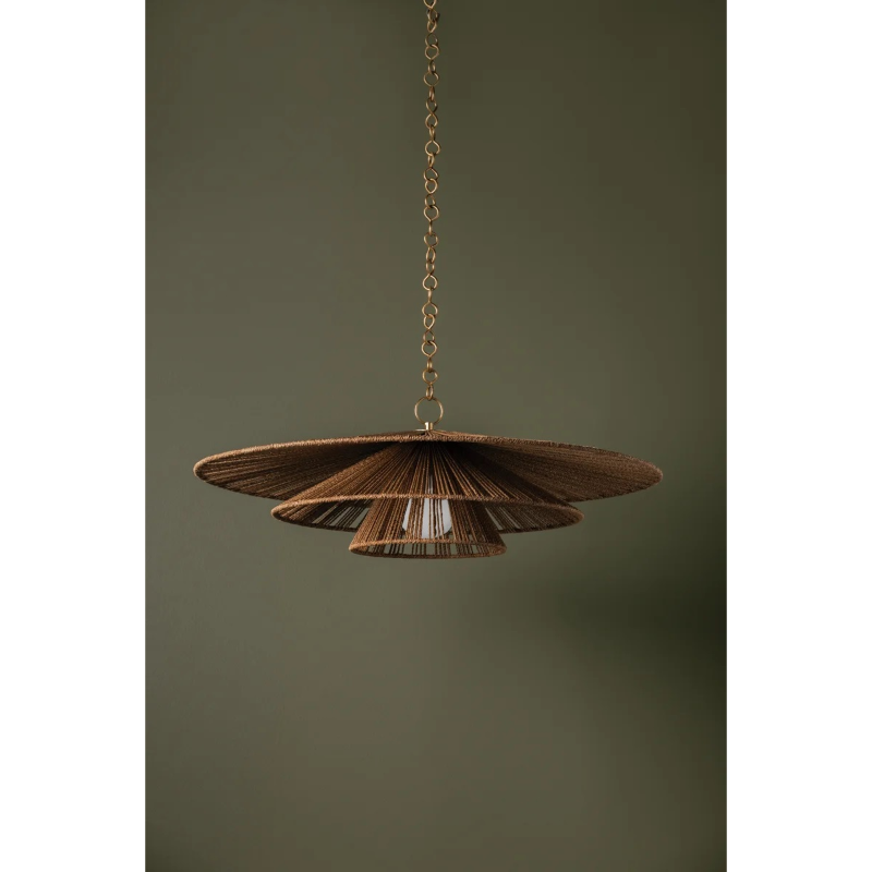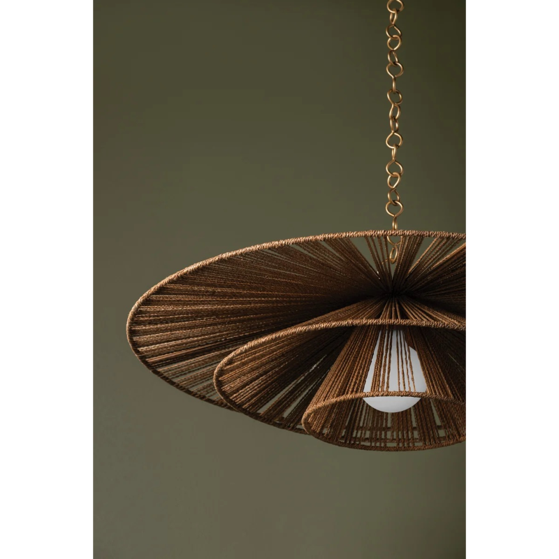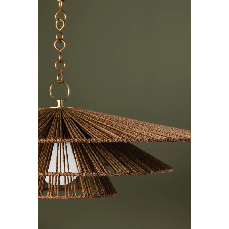 Three shades of wrapped natural Abaca Cord are nested into one another in the dramatic Leven, creating a layered and voluminous silhouette. A thick Vintage Gold Leaf chain suspends the fixture, adding a contrast to the natural materials. Available in two sizes, this distinctive pendant levitates overhead with a captivating glow. *Due to the one-of-a-kind nature of the medium, exact colors and patterns may vary slightly from the image shown.