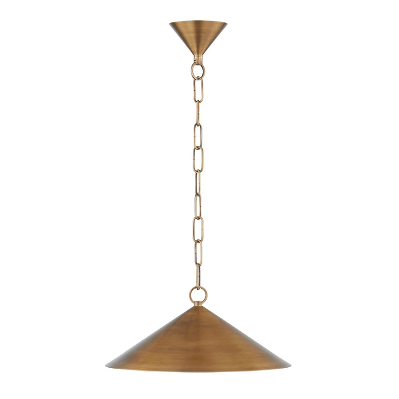A straightforward conical shade is complemented by a similarly shaped canopy or backplate. The hard lines of the cones are broken up by graceful linked metalwork that draws the eye and makes the fixture feel unique. Both the pendant and wall sconce are lit from within by a single small bulb for a beautiful, soft lighting effect. The familiar silhouette and gorgeous warm tones of the Patina Brass make Midvale feel comfortable in just about any interior.