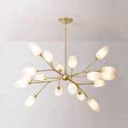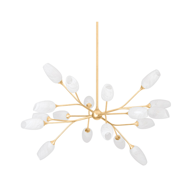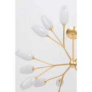 Inspired by the sprightly buds of a dill plant, individual clusters of stems branch away from one another in the show-stopping Aldean. Each shade is handcrafted from Cloud Glass and supported by a framework finished in Vintage Gold Leaf. When illuminated, this fixture casts shadows on the ceiling, introducing drama to any space. Aldean is available as a 3-light sconce and a 9-light or 18-light chandelier.