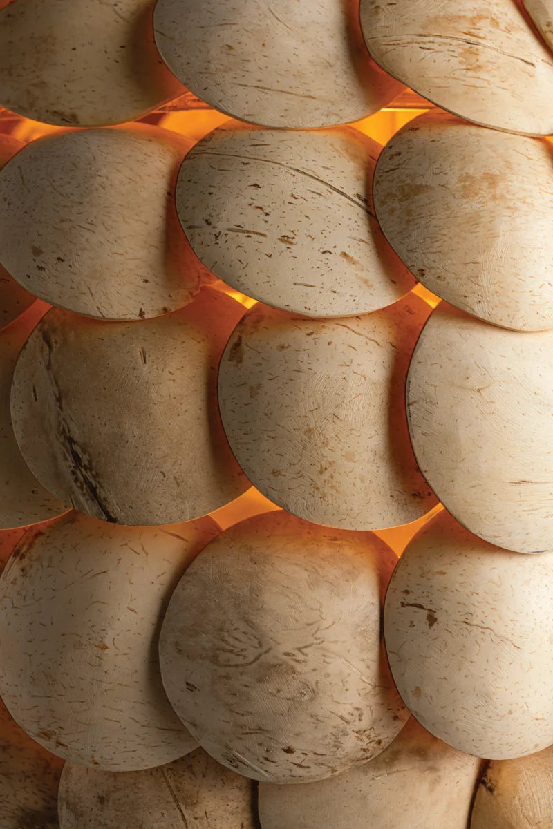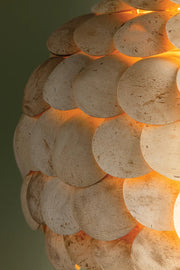 Entirely covered in layered coco shell discs, the Edric pendant is a celebration of natural texture and color variance. The overlapping shell pieces form a voluminous, spherical shade, showcasing the variety of neutral tones.