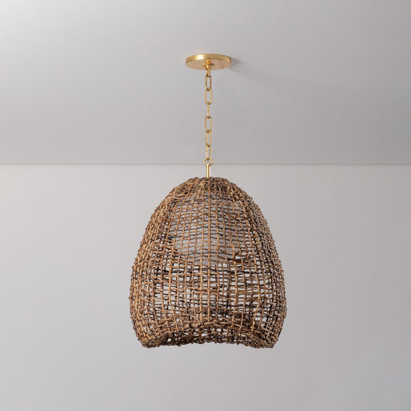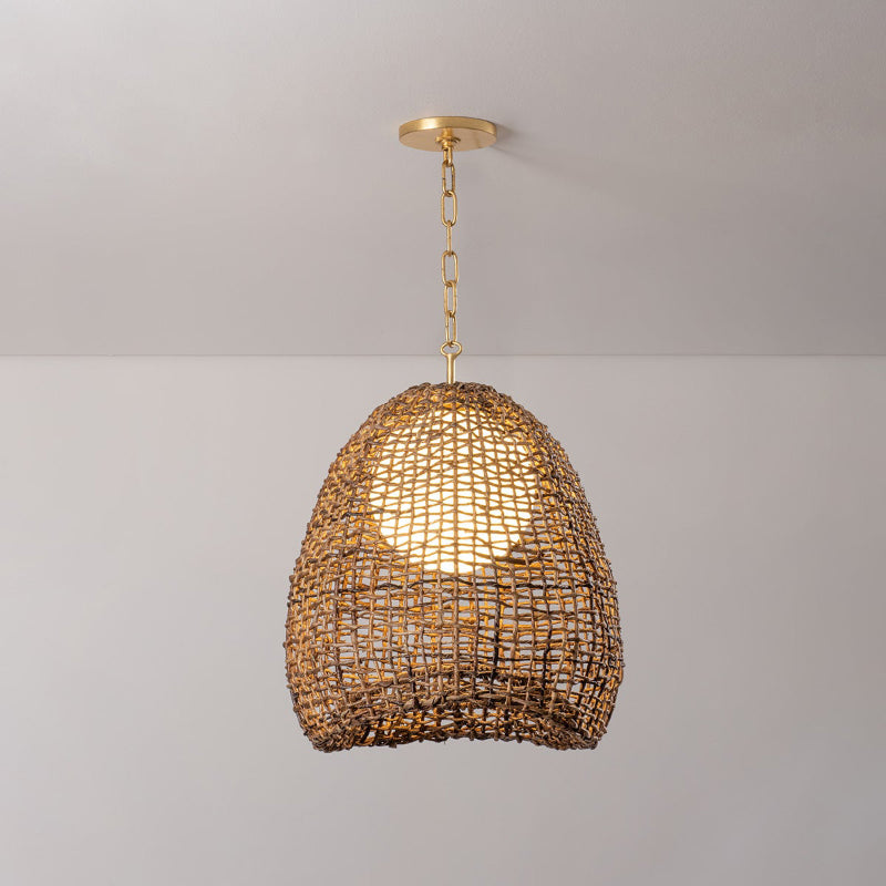 Playing with translucency and a loose natural weave, Maester mixes maritime and organic influences. Resembling an antique buoy wrapped in a net, a large Opal Shiny glass shade is nested into a woven abaca exterior.