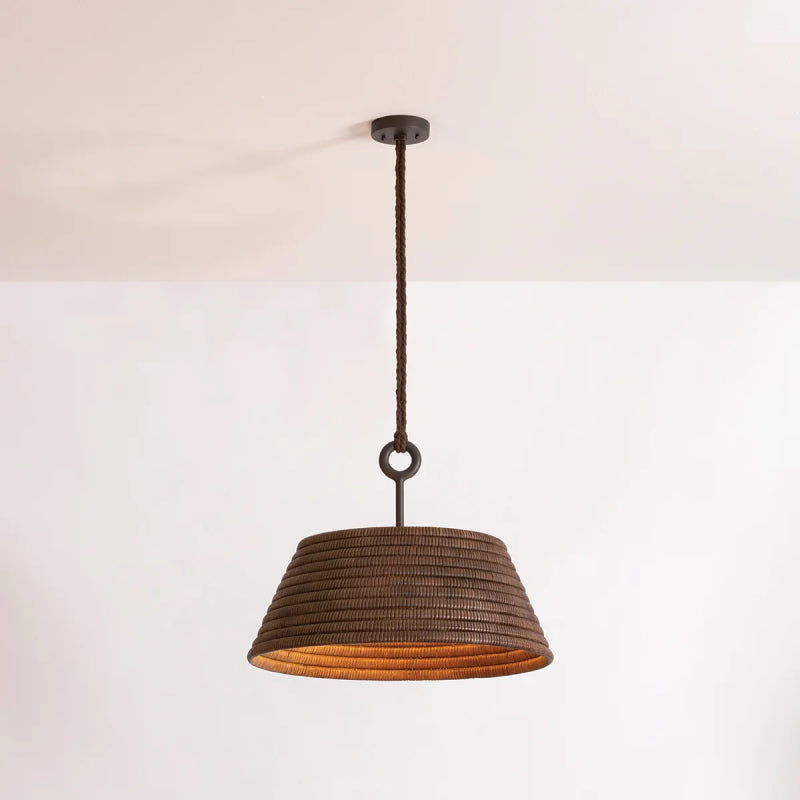 Inspired by artisanal handicraft, this pendant features an elegant woven natural shade paired with robust forged metalwork. The basket-like shape of the shade, with its uniform weave and simple top loop, recalls nautical motifs.