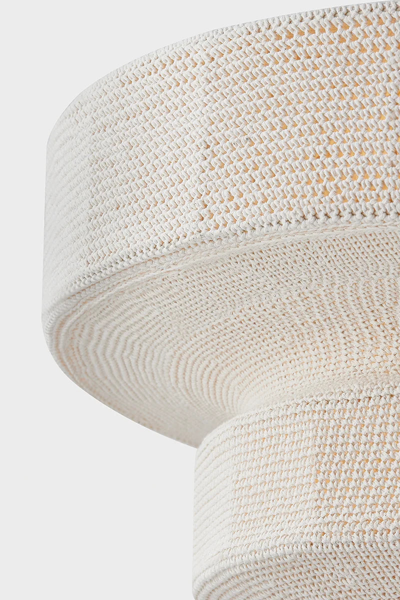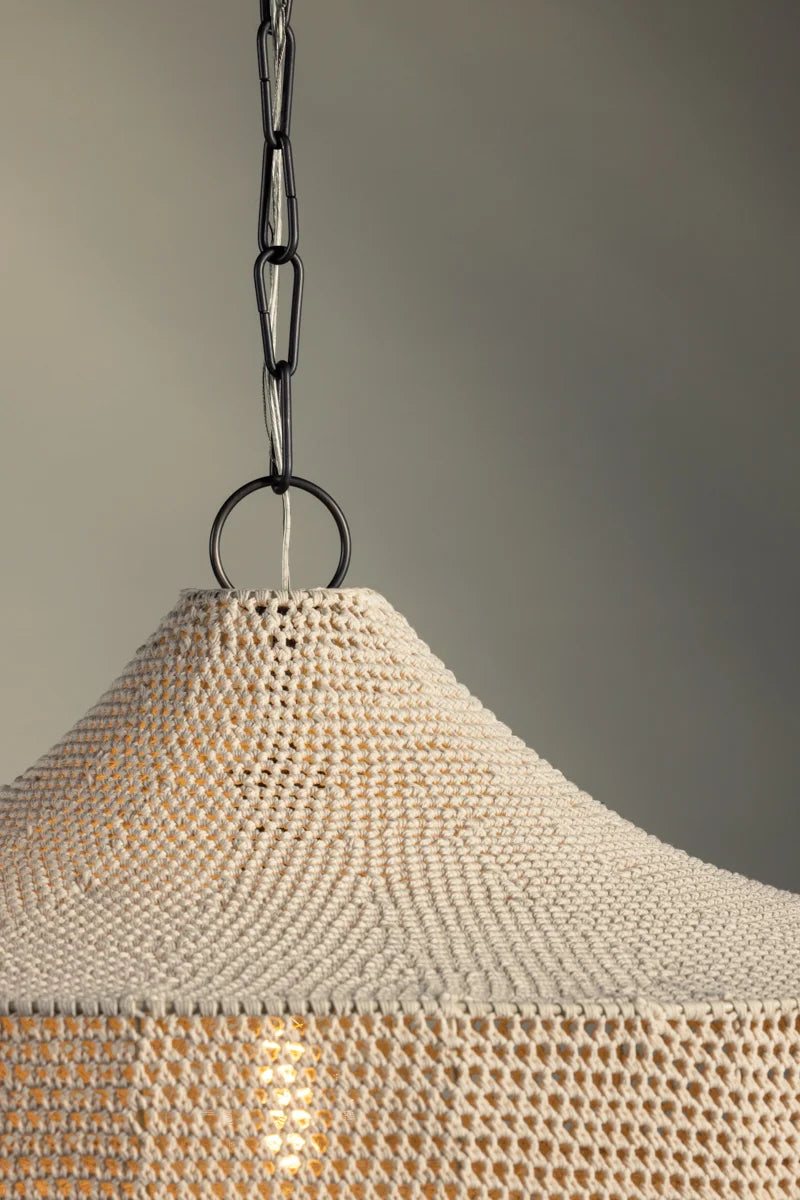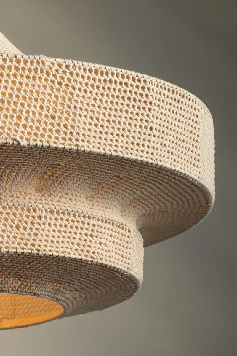 Recalling the comfort of a ferry station during harsh conditions, the artist Chandler McLellan sought to imbue this pendant with a soft warmth in both materiality and luminance. A thick off-white cotton crochet fabric has been stretched across the tiered framework of the fixture, naturally dipping in certain areas. As the weave eases and pulls, it creates larger and smaller gaps for light to escape.