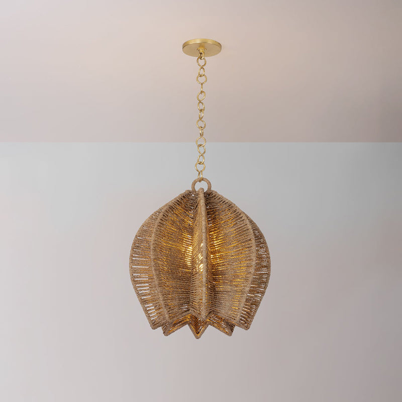Crafted from Natural Abaca rope, this botanically-inspired pendant emanates charm with an intricate shape and weave pattern. Valatie is suspended by a Vintage Gold Leaf chain that melds with the natural hue of the Abaca while adding a luxurious touch.