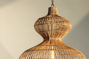 Embodying a sense of refuge, warmth, and reprieve, the Irvine pendant recalls a traditional Vietnamese hanging lantern with a modern, sculptural twist. Featuring two tiers of rounded shapes that cinch in the center, the balanced silhouette appears to gently undulate overhead. The loose rattan weave allows light to sift through, casting a warm and inviting glow throughout a space.