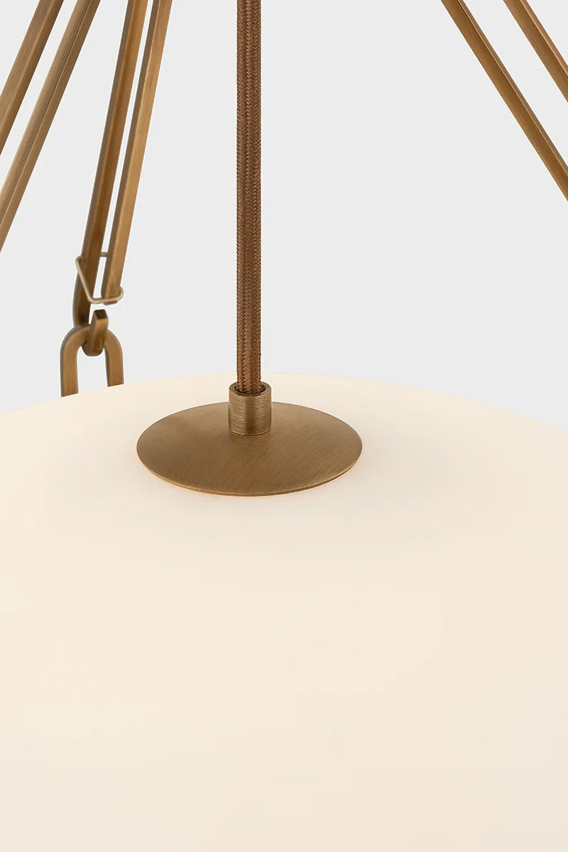 The Kade pendant updates a nostalgic shape with sleek, industrial metalwork and two large opal matte glass shades. Inspired by vintage elements, it features a striking suspension technique with three oversized loops connecting to the central housing above the fixture.