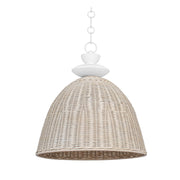 A white-washed wicker dome shade is suspended from a jewelry-like Gesso White chain and topped with stacked stone accents giving Kahn a clean and fresh look. The natural materials, white palette and smooth shapes make this pendant feel organic, modern and coastal all at the same time.
