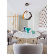 At first glance the hand-worked iron exterior has a depth and perspective that is unexpected in a metal piece. It is the variation in geometric shape, angles, and actual thickness of the metal that contribute to the dynamic dimension, playing with perspective and offering a fresh and unique view from any angle.