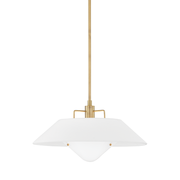 Playing with material and shape, Otto features a white linen shade with a glass diffuser in coordinating streamlined shapes. Patina Brass metalwork with unique details like finials directly on the diffuser and angled rods on the socket, add to the design's overall fresh, clean look.