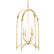 An open, airy curved cage holds four candelabra bulbs flowing from a center orb creating a soothing, sophisticated silhouette. The cage features smooth accent shapes and flowing teardrops that accentuate the pendant's slim profile and graceful look. Go for a cooler look in Black Iron or add warmth with the Vintage Gold Leaf.