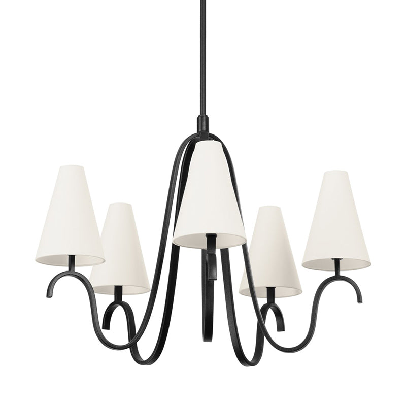 Traditional off-white linen shades contrast against soft, swooping Forged Iron metalwork to create the perfect transitional piece. Available as a one-light sconce and three- or five-light chandelier, Melor adds chic style to any interior.