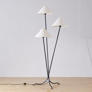 Sleek Forged Iron arms draw the eye to three tapered, off-white linen shades, creating a layered effect and giving Cedar its recognizable clean, modern silhouette. The floor lamp's unique tripod base and wavy feet add a touch of softness and unexpected whimsy.