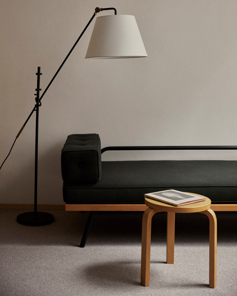 Navin's slender Textured Black arms and tapered white-linen drum shades get an industrial-inspired upgrade with mechanical parts in Patina Brass. Both the arm and shade angles of the floor lamp, chandelier, and sconce are fully adjustable to provide customized lighting for any space.