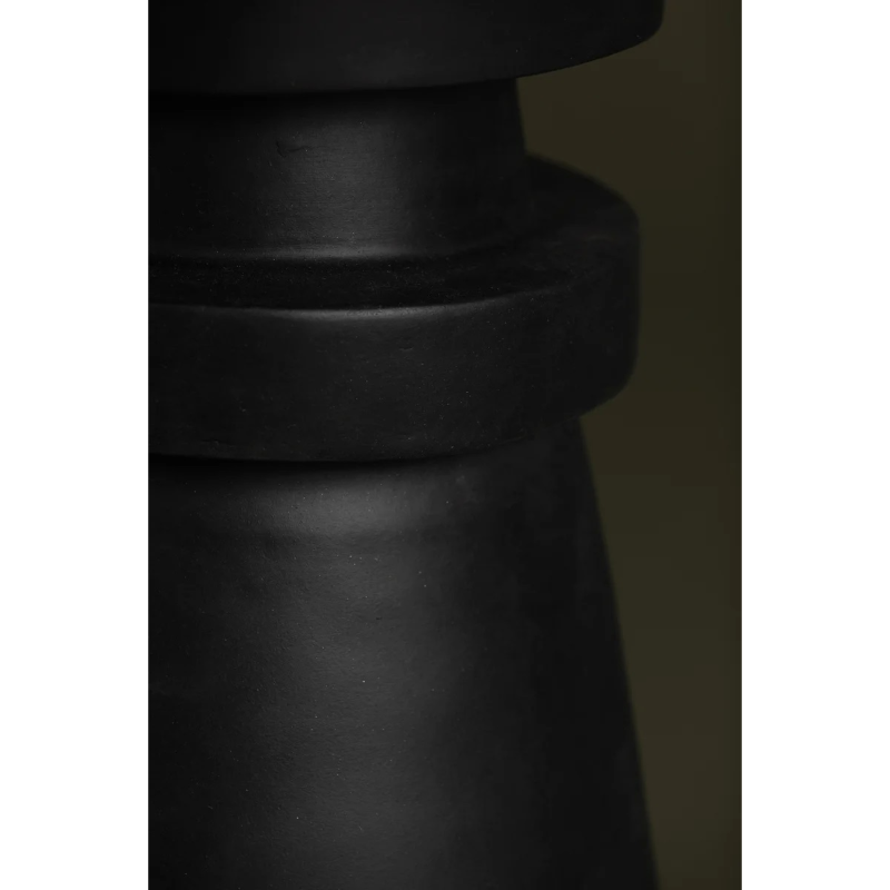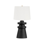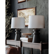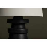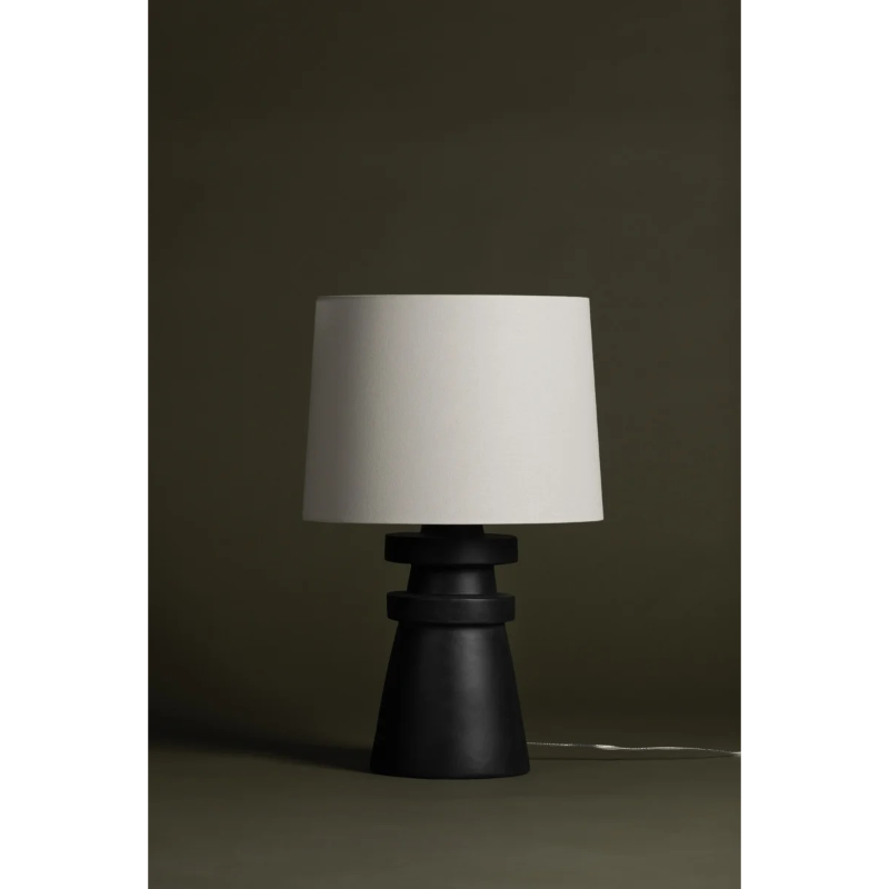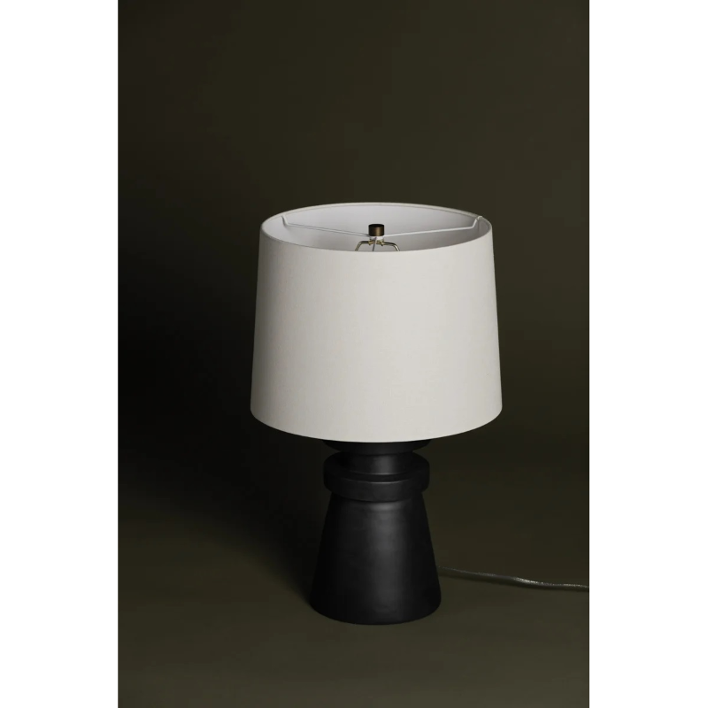 A conical base of charcoal ceramic gives Grover a hand-crafted feel that makes a strong sculptural statement. The ceramic rings add visual interest and balance and the off-white linen drum shade brings contrast and texture to this artistic, modern table lamp.