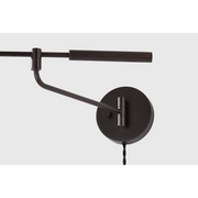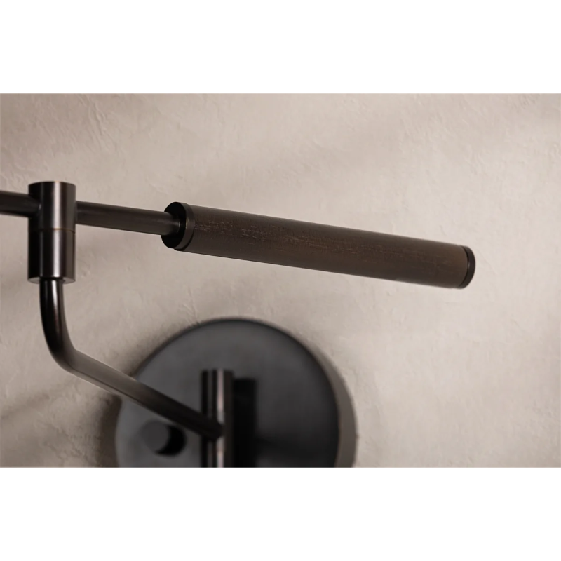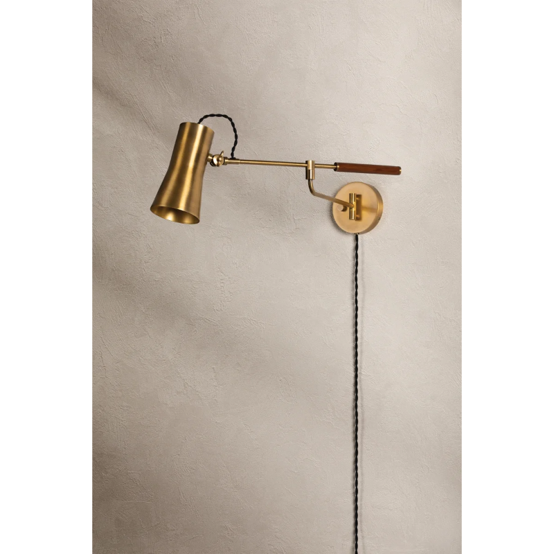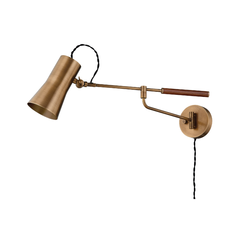 Tailored task lighting, this portable, functional swing arm sconce is also thoughtfully designed and beautiful. The sleek arm features a wooden handle on one end and an adjustable metal shade in Patina Brass or Bronze on the other. The twisted black cord detailing at the shade and backplate give Novel a nostalgic feel. Part of our Lauren Liess collection.