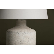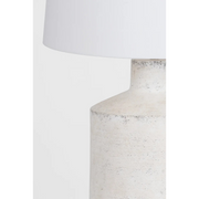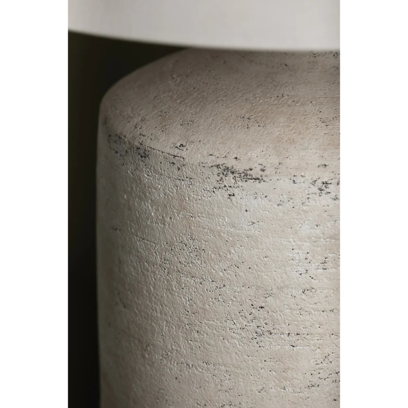 This sleek, subtle lamp is a natural, neutral way to add an organic modern style to any tabletop. Light shines down from the white linen drum shade highlighting the texture and natural color variations in the weathered finish of the artifact white ceramic base.