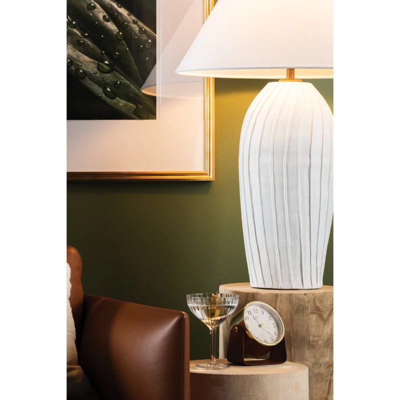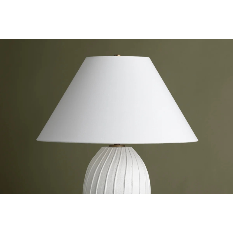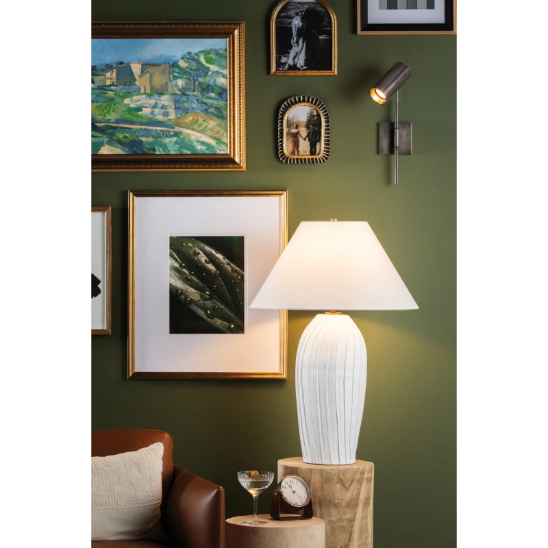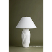 Pleat-like folds ripple down the hand-sculpted Deacon, lending this ceramic table lamp its artisanal charm. The base's chalky white finish is complemented by a crisp natural linen shade, adding to the minimalist appearance. Place Deacon on a table, desk, or bedside for artistic yet approachable illumination.