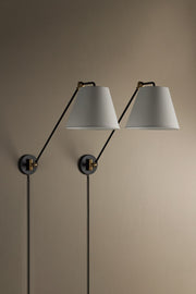 Navin's slender Textured Black arms and tapered white-linen drum shades get an industrial-inspired upgrade with mechanical parts in Patina Brass. Both the arm and shade angles of the floor lamp, chandelier, and sconce are fully adjustable to provide customized lighting for any space.