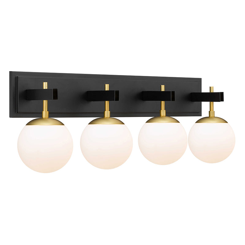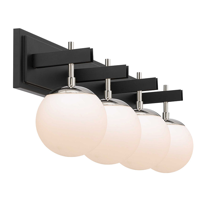 Mid-Century and Post Modern Design Influences. Gorgeous White Recycled Glass Globes. Easy Re-lamping. Two Tone Satin Black with Brass or Polished Nickel with Black Finshes.