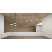 Composed of a collection of hand blown glass spheres with LED light source suspended at different heights, anchored to the ceiling via a floating tubular structure.