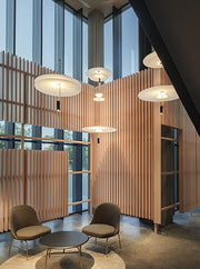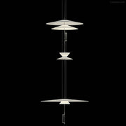 Hanging lamp designed for large and high ceiling spaces. A large light chandelier with a contemporary sculptural quality where floating circles of light generate a luminous ambiance.