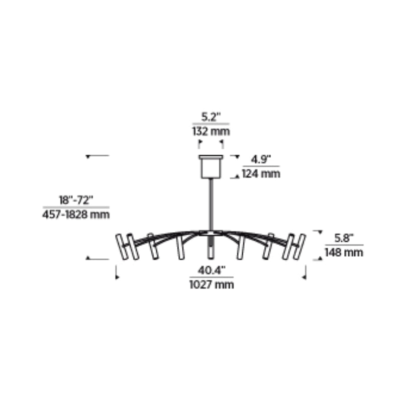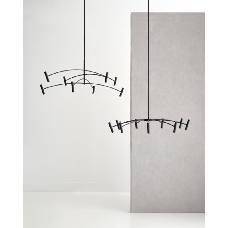 This Aerial chandelier by Sean Lavin for Tech Lighting features symmetrically spaced arched rods supporting a ring of slim cylindrical heads. The cylinders produce up and down illumination while concealing the integrated LED light sources. Offered in Matte Black. A great piece to coordinate with the smaller scale Aerial chandelier in your open living space, dining area and foyer.