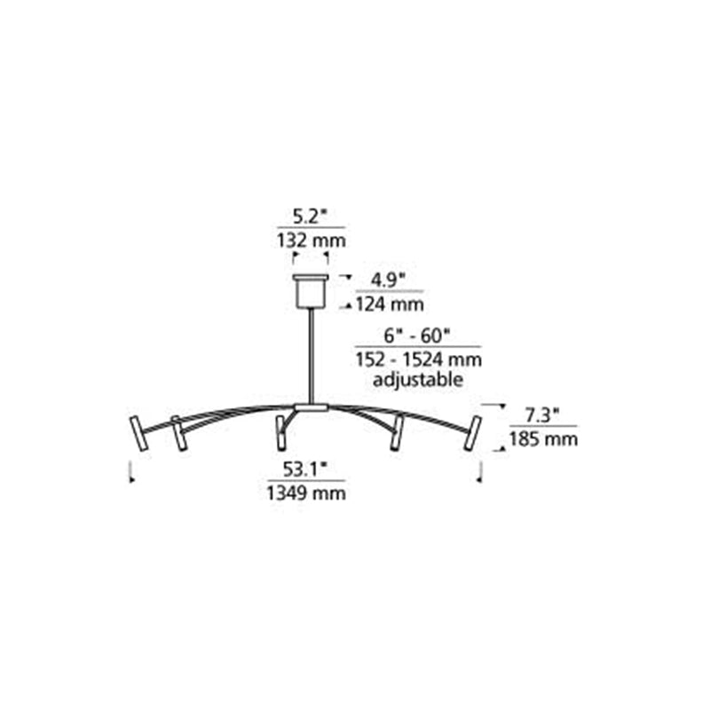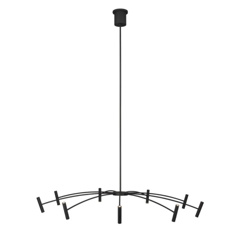 This Aerial chandelier by Sean Lavin for Tech Lighting features symmetrically spaced arched rods supporting a ring of slim cylindrical heads. The cylinders produce up and down illumination while concealing the integrated LED light sources. Offered in Matte Black. A great piece to coordinate with the smaller scale Aerial chandelier in your open living space, dining area and foyer.