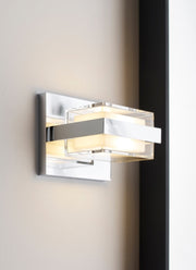 The Kamden wall sconce by Sean Lavin features two ultra-clean, square acrylic shades are hand-polished then mounted in a die-cast metal frame. Powerful LEDs direct light through the glass in both directions. The light cubes are mounted to a carefully finished metal back plate and can be mounted vertically or horizontally making the Kamden wall ideal for hallway lighting, bathroom lighting and bedroom lighting.
