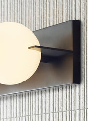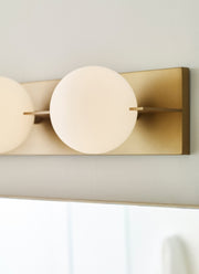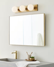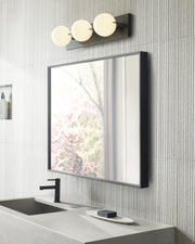 The Orbel Collection by Sean Lavin for Tech Lighting is inspired by Mid-Century modern art with contrasting geometric shapes. The Orbel 3-Light Bath Light fixture features three stacked frosted spheres supported by a rectangular metal base.