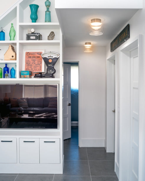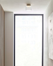 The Casen Drum flush mount features a sleek closed bottom glass shade that’s suspended from a handsome die-cast metal band, cleverly hiding the LED light source, just below the ceiling. This light is beautifully illuminated by the cylinder shaped shade providing an even glow, free of hot spots.
