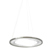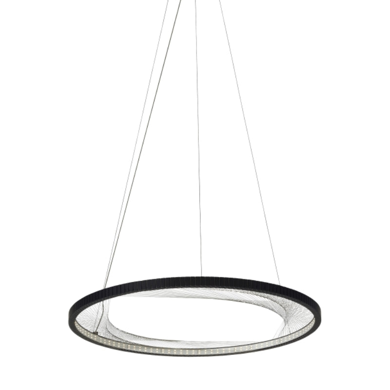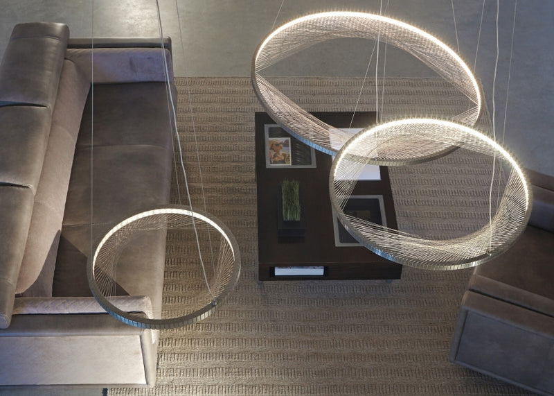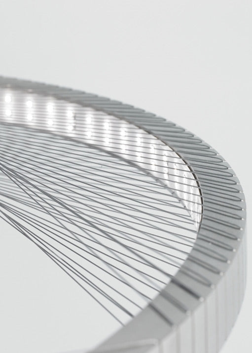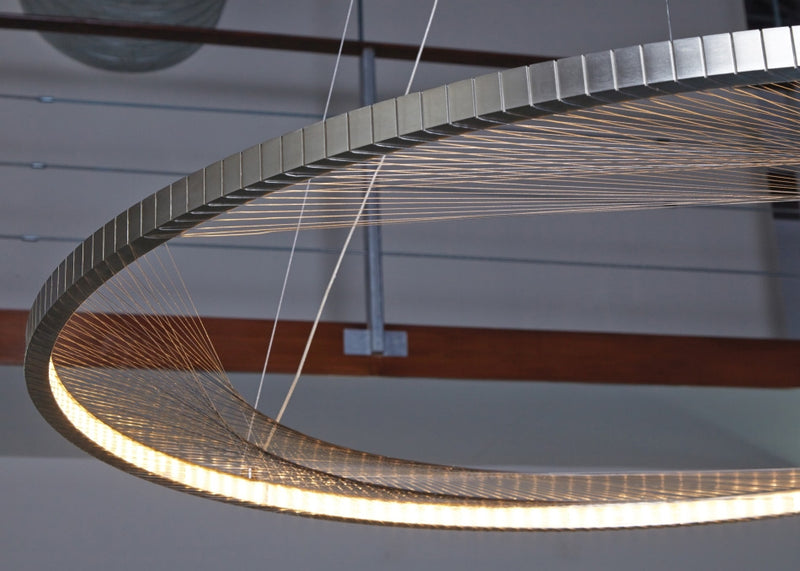 A large 30-inch aluminum outer ring is machined to receive hundreds of hand-strung strands of stainless steel cable which create an intricate, interwoven pattern. Powerful LEDs shine inward upon the reflective cables to create visually interesting general illumination.