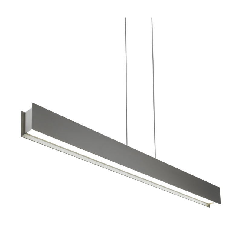 The Vandor linear suspension piece by VC Modern features parallel planes of cold rolled steel coated in a matte rubberized paint. Satin Nickel coated end-caps house a recessed LED source that is designed to distribute a significant punch of task lighting onto surfaces below without an uncomfortable glare.