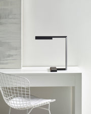 The Dessau 16 Table Lamp by Sean Lavin was inspired by the architecture, function and beauty of the Bauhaus movement with a linear formation intersecting at a 90 degree angle. Emulating a modernized pharmacy lamp, the Dessau Table Lamp design houses a slim recessed panel of integrated LED lengths. The modern fixture includes an integrated 3-step touch dimmer to conveniently achieve your preferred ambiance.