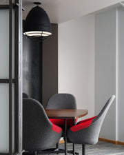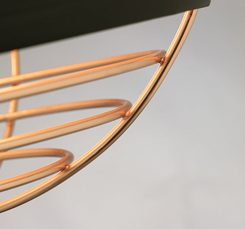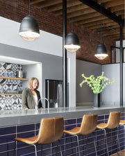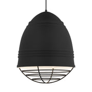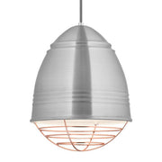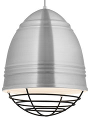 This stylized and elevated interpretation of industrial high bay lighting features rubberized paint on the ribbed spun-metal shade to provide a smooth, matte finish while a choice of metallic plated cage adds a custom look.