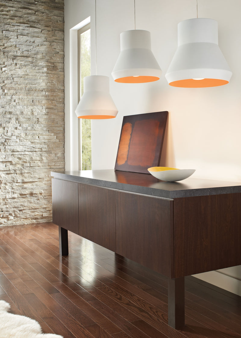 The traditional silhouette of early The Milo pendant light by Tech Lighting is a vibrant twist on the traditional early twentieth century factory light. The Milo features invigorating colors combinations, each color combination brings about a fun and slightly playful motif to this moderately scaled pendant. The Milo is ideal for kitchen island task lighting, hallway lighting and dining room lighting.