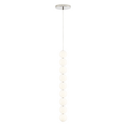 The Orbet 9-Light Line-Voltage Pendant by Sean Lavin for Tech Lighting is inspired by the classic pearl with perfectly stacked milk glass orbs. LED illumination through milk-glass provides a soft diffused aesthetic and each orb is accented by a thin contrasting metal band. This fixture is the perfect design for hanging individually or clustering in multiples for a dramatic effect.