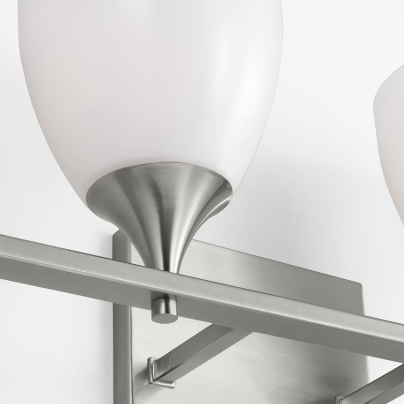 The Toffino 4-Light Vanity by Drew & Jonathan features four milk glass shades that provide a soft, ambient uplight, enhancing the atmosphere of any bathroom.