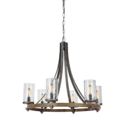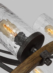 Influenced by both rustic and industrial design, the transitional Angelo chandelier collection by Feiss celebrates the beauty of imperfection and the visual impact of mixed materials to create an overall rugged look. The cylindrical Clear Thick Wavy glass shades complement the two-toned finish of Distressed Weathered Oak on the outer structures and a new pitted, richly textured Slated Grey Metal finish on the sloping arms for a rustic but tailored look. Perfect as foyer lighting, living room lighting, or paired over a dining room table, and the largest fixture will be the crowning touch to any great room.