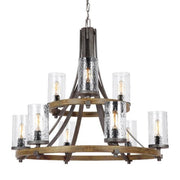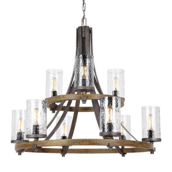 Influenced by both rustic and industrial design, the transitional Angelo chandelier collection by Feiss celebrates the beauty of imperfection and the visual impact of mixed materials to create an overall rugged look. The cylindrical Clear Thick Wavy glass shades complement the two-toned finish of Distressed Weathered Oak on the outer structures and a new pitted, richly textured Slated Grey Metal finish on the sloping arms for a rustic but tailored look. Perfect as foyer lighting, living room lighting, or paired over a dining room table, and the largest fixture will be the crowning touch to any great room.