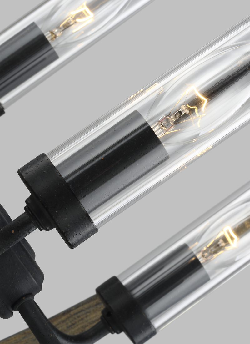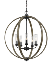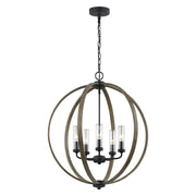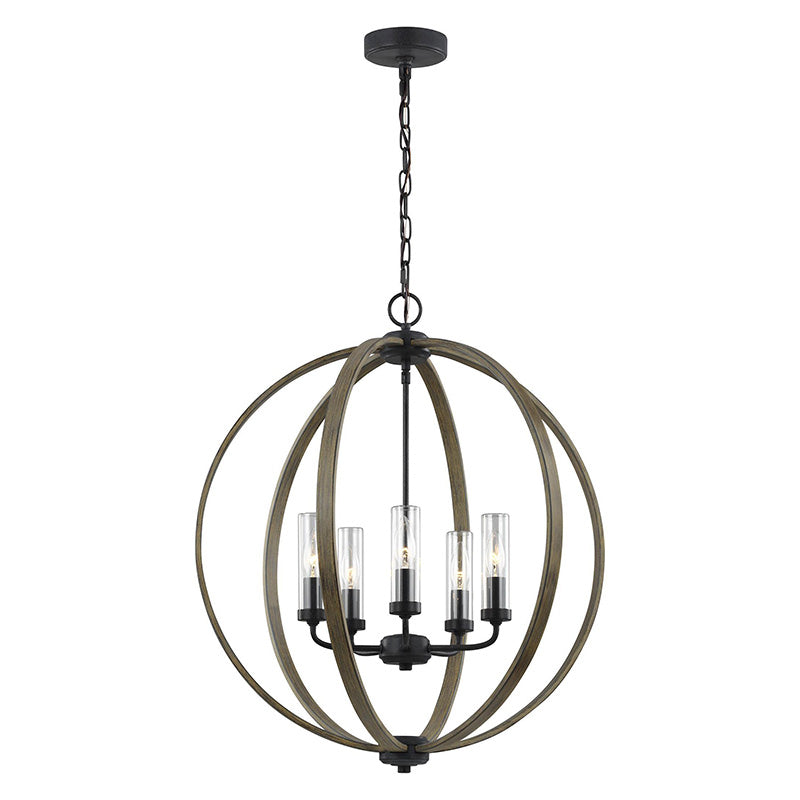 The Allier Outdoor chandelier makes an elegantly rustic statement by blending warm wood tones with Antique Forged Iron hardware on a modern orb silhouette.