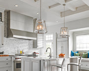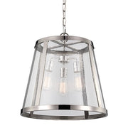 Combining the traditional profile of a tapered shade with on-trend seeded glass, the polished nickel frame and the square-linked chain gives the Harrow Collection an elevated, contemporary yet delicate look.