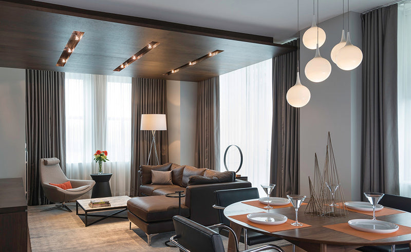 The Pele pendant light by Tech Lighting features a contemporary mid-century modern-inspired design. With its funneled glass detail and perfectly spherical design the Pele pedant provides an ample amount of omnidirectional illumination.