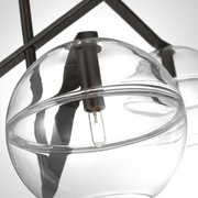The Lowing Grande Chandelier by Sean Lavin is best described as a deconstructed modern chandelier, where glass orbs are each suspended from the sleek branchlike central hub via contrasting textured cloth-covered cords to make a distinctly alluring visual statement. While each transparent clear glass orb is perfectly spherical and smooth on the exterior surface, the interior surface features gradually thickening bands of glass artfully crafted by talented artisans to add alluring visual interest and dimension to your space.