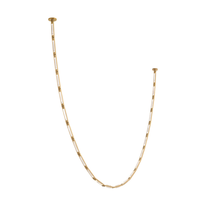 The Catena series by Sean Lavin is inspired by its name, which means "chain link" in Italian. Meticulously crafted hardware cradles a faceted rectangular-shaped crystal with innovative LED technology, resulting in a jewelry-like draped form. Screwless solid brass construction allows electricity to flow in any configuration of chandeliers, pendants, and sconces.
