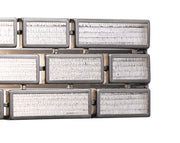 You've been framed. A superhero of sparkle and strength, Harlowe lightly twists Mid Century Modern and Streamline Moderne design. Its ribbed recycled glass has texture pressed into the backside to create its sparkly effect. Its recycled steel framework presents a subtle repeated H pattern. Harlowe delivers bling to today's discerning decors.